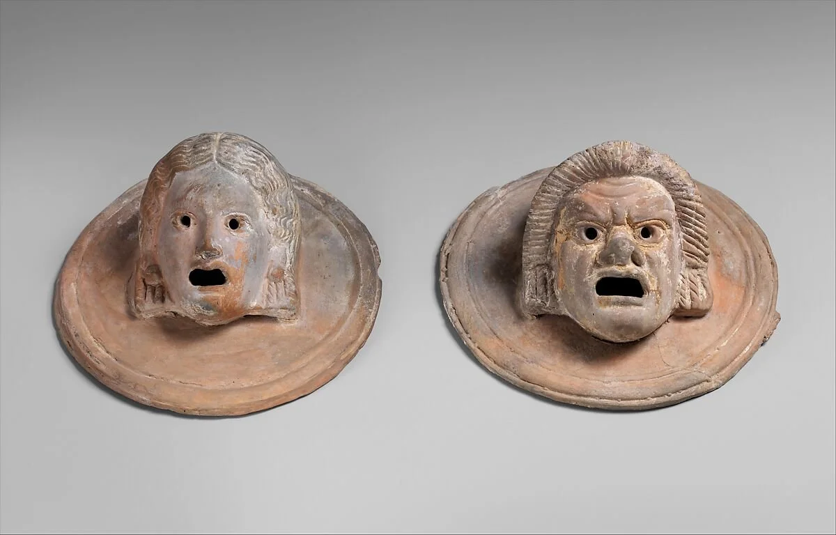 “A pair of terracotta roundels with theater masks.” (Copied from Met Museum website).
